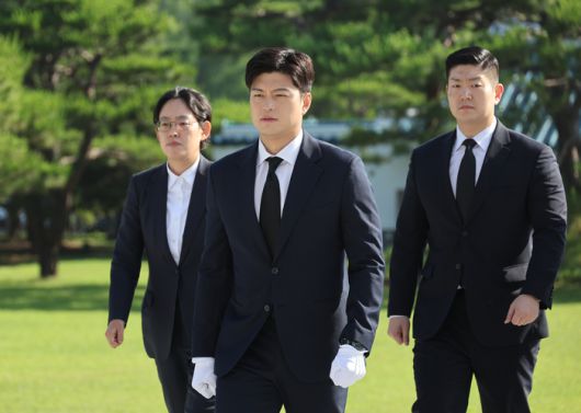 국민의힘 김용태 비상대책위원장(가운데)이 22일 국립서울현충원 현충탑을 참배하기 위해 이동하고 있다. [사진출처=연합뉴스] |