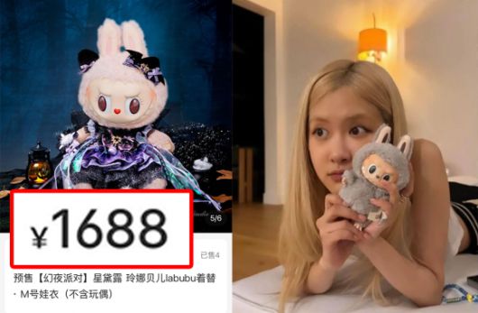 1688위안(약 30만원)에 판매되고 있는 라부부 인형 옷(왼쪽)과 라부부 인형을 든 채 미소짓고 있는 로제. 사진=샤오홍슈, 로제 인스타그램 캡처 |