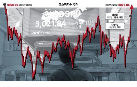 이날 한국거래소에 따르면 지난주(16~20일) 코스피는 전주(2894.62) 대비 127.2포인트(4.4%) 오른 3021.84에 거래를 마쳤다. 코스피가 종가 기준 3000선을 넘은 건 2021년 12월28일(3020.24) 이후 3년6개월 만이다.