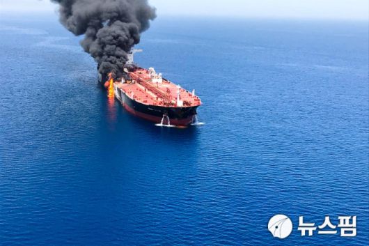 호르무즈해협 부근 오만해에서 공격을 당한 유조선에서 검은 연기가 솟아 오르고 있다. [사진=로이터 뉴스핌] |