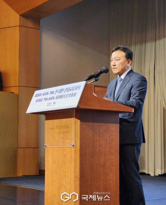 (목포=국제뉴스) 유지현 기자 = 18일 전남 목포시 호텔현대 바이 라한 목포에서 문화체육관광부 주최로 열린 제38차 KATA/TVA 한·대만 관광교류회의 환영만찬에서 인사말을 하는 김명준 목포시 관광문화교육국장.