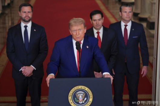 [워싱턴=AP/뉴시스] 도널드 트럼프 미국 대통령이 21일(현지 시간) 백악관 이스트룸에서 미군의 이란 핵 시설 공습에 관해 발언하고 있다. 트럼프 대통령은 "이란의 핵 프로그램에 대한 선제적 조치로, 정밀 타격이 성공적으로 이루어졌다"라고 밝혔다. 이 자리에는 JD 밴스 부통령, 마코 루비오 국무장관, 피트 헤그세스 국방장관이 배석했다. 2025.06.22. /사진=민경찬 |
