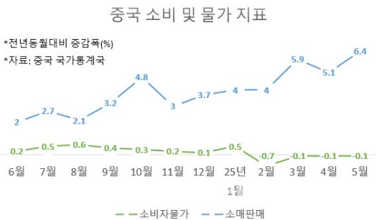 중국 국가통계국에 따르면 지난 5월 소매판매는 전년동월대비 6.4% 증가하면서 시장 예상치(5.0%)를 크게 웃돌았다. 증가폭은 전월(5.1%)을 훌쩍 넘는 수준으로 지난 2023년 12월(7.4%) 이후 가장 높다.