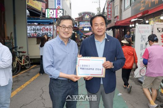 〔스포츠서울│오산=좌승훈기자〕이권재 오산시장은 21일 오색시장에서 진행된 ‘경기 살리기 통큰 세일 개막식’을 위해 방문한 김동연 경기도지사에게 주요 현안사업에 필요한 사업비를 제1차 경기도 특별조정교부금에 반영해 달라고 요청했다.