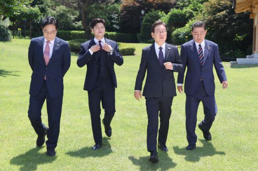 이재명 대통령이 22일 서울 한남동 관저에서 열린 여야 지도부 오찬 회동에서 기념 촬영을 마친 뒤 자리로 향하고 있다. 왼쪽부터 국민의힘 송언석 원내대표, 김용태 비상대책위원장, 이 대통령, 더불어민주당 김병기 당대표 직무대행 겸 원내대표. 대통령실사진기자단 |