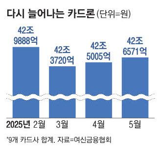 22일 여신금융협회에 따르면 지난 5월 9개 카드사(신한·삼성·현대·KB국민·롯데·하나·우리·BC·NH농협카드)의 카드론 잔액은 42조6571억원으로 전달 대비 1566억원 늘어났다. 지난 4월에 이어 두 달 연속 증가한 것이다.