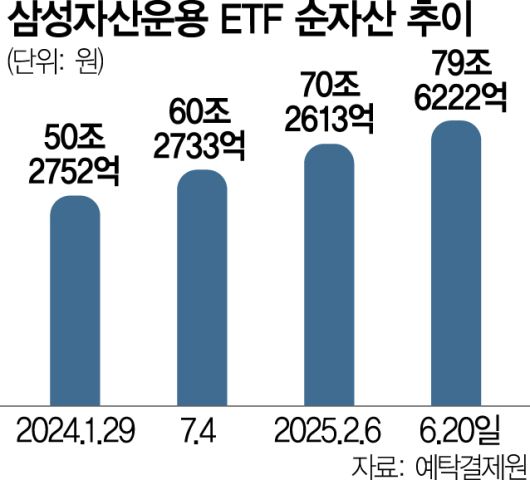 국내 증시 호조에 국내 주식형 상장지수펀드(ETF) 강자 삼성자산운용이 덩달아 웃고 있다. 올 들어 ETF 순자산이 13조 원 넘게 증가하며 국내 자산운용사 중 최초로 순자산 80조 원 돌파를 눈앞에 뒀다.