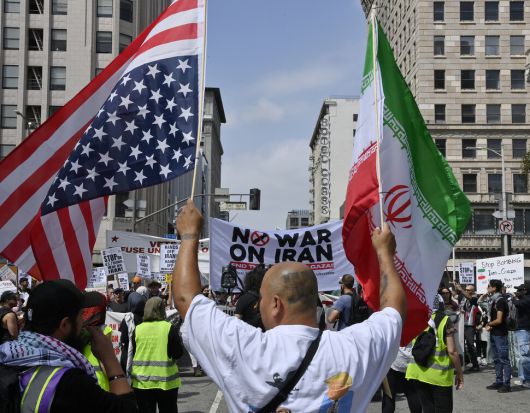 21일(현지시각) 미국이 이스라엘과 이란 간 전쟁에 개입해선 안된다고 반대하는 시위대가 로스앤젤레스 도심에서 행진을 벌이고 있다. 이 시위 직후, 도널드 트럼프 미국 대통령은 대국민 연설을 통해 이란의 핵시설 3곳을 “초토화시켰다”고 밝혔다. 로스앤젤레스/UPI 연합뉴스 |
