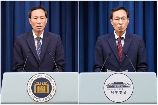 우상호 정무수석이 22일 서울 용산 대통령실 청사에서 여야 지도부 회동 관련 브리핑을 하고 있다. 이날 대통령실은 대통령실 청사를 형상화한 기존 로고 대신 청와대 로고가 적용된 발언대를 사용하기 시작했다. 왼쪽 사진은 지난 19일 기존 대통령실 청사 로고가 적용된 모습. 김호영 기자 |