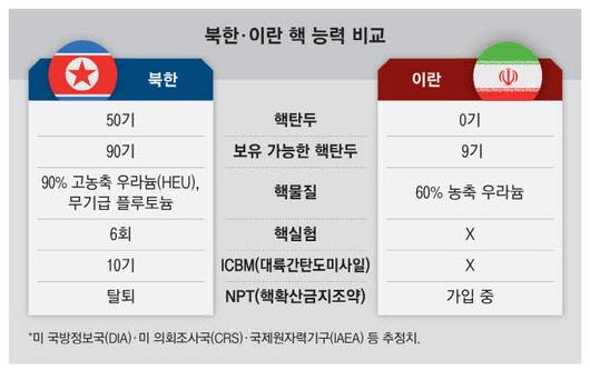 22일 미국 의회조사국(CRS) 등 국제기구·싱크탱크 보고서를 종합하면 북한은 핵무기 보유량, 핵무기 발사 역량 등에서 이란을 압도한다. 아직 핵탄두가 없는 이란과 달리 북한은 올해 기준 핵탄두를 50기 보유하고 있는 것으로 추정된다.