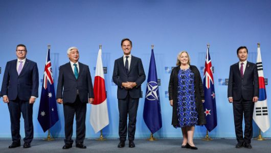 지난해 10월 김선호 국방부 차관이 벨기에 브뤼셀에서 열린 북대서양조약기구(NATO·나토) 국방장관회의에서 마르크 뤼터 사무총장(가운데), 호주·일본·뉴질랜드 장관들과 기념사진을 찍는 모습. 나토 |