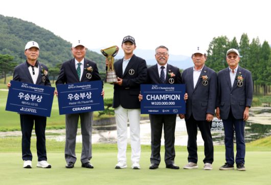 옥태훈이 제68회 한국프로골프(KPGA) 선수권 대회(총상금 16억 원) 정상에 올랐다. 옥태훈은 22일 경남 양산 에이원CC(파71)에서 열린 대회 최종 4라운드에서 이글 1개와 버디 7개를 몰아쳐 9언더파 62타를 기록했다. 최종 합계 20언더파 264타를 적어낸 옥태훈은 2위 김민규(17언더파)를 3타 차로 제쳤다. KPGA 투어 첫 우승을 달성한 옥태훈은 상금과 제네시스 대상 포인트 1위로 올라섰다. 시상식 후 이명하(왼쪽부터) KPGA 고문, 문홍식 KPGA 고문, 옥태훈, 김원섭 KPGA 회장, KPGA 원로인 최윤수, 이강선이 기념 촬영을 하고 있다. 사진 제공=KPGA
