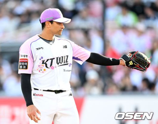 [OSEN=수원, 이대선 기자] 22일 오후 수원 KT위즈파크에서 2025 신한 SOL Bank KBO리그 KT 위즈와 NC 다이노스의 경기가 열렸다. KT는 쿠에바스, NC는 로건을 선발투수로 내세웠다 5회초 2사에서 KT 쿠에바스가 자신의 투구에 맞은 NC 김휘집에게 사과를하고 있다. 2025.06.22 /sunday@osen.co.kr