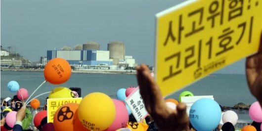 일본 후쿠시마 원전 사고 한달 뒤인 2011년 4월 차단기 고장으로 멈춰 선 고리 원전 1호기. 당시 환경운동연합 등 환경단체 회원들이 고리 1호기 인근 해안에서 폐쇄를 촉구하는 집회를 열었다. 부산/연합뉴스 |