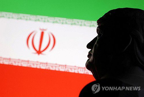 이란 국기 배경의 트럼프 모형(일러스트) |