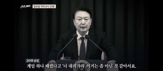 심지어 '스트레이트'가 전날 선공개한 예고편에서 한 20대 남성은 "계엄 하나 때렸다고 '너 내려가라' 이거는 좀 아닌 것 같다"고 말한다.
