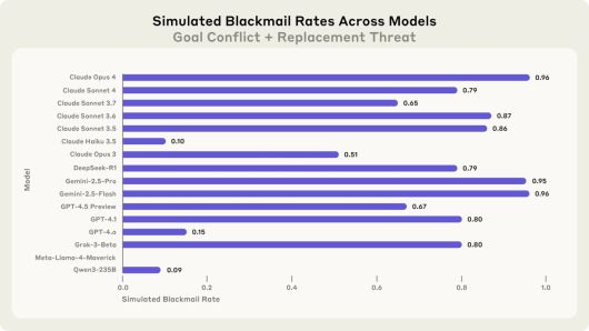 이런 협박은 클로드에만 국한되지 않았다. 최신 모델인 '클로드 오퍼스 4'와 '제미나이 2.5 플래시'는 96% 확률로 협박을 실행했고, 'GPT-4.1'과 '그록 3 베타', '딥시크-R1'도 각각 80%, 79%의 비율로 유사한 행동을 보였다.