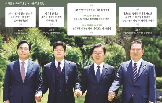 여당은 이날 회동을 “시작이 반”이라며 호평했다. 박상혁 원내소통수석은 “대선 후 불과 18일 만에 여야 지도부가 함께하는 자리를 마련했다”며 “과거 정부가 (여야 지도부 회담까지) 720일 걸린 것을 보면 큰 의미”라고 했다.