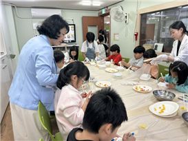 보건소 영양사가 기관을 방문해 편식 예방, 식사 예절을 교육하고, 6가지 식품군을 활용한 라이스페이퍼 고구마 치즈스틱을 함께 만들었다.