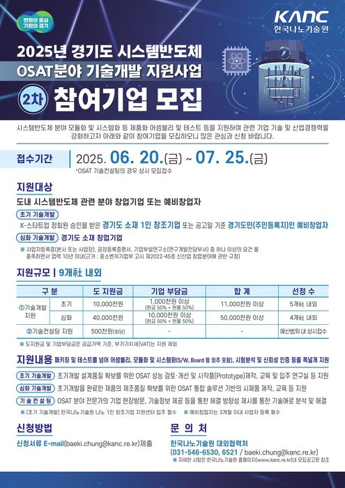 경기도는 시스템반도체 산업 생태계 강화를 위해 '2025년도 경기도 시스템반도체 후공정(OSAT) 분야 기술개발 지원사업'에 참여할 도내 창업기업을 다음달 25일까지 모집한다고 22일 밝혔다.
