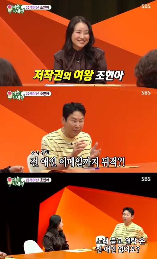 신동엽은 "조현아가 가사를 쓰다 어려움이 생기면 헤어진 남자친구의 이메일까지 뒤적인다더라"고 전해 웃음을 자아냈다.