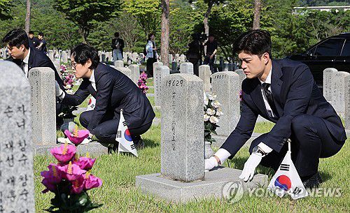 (서울=연합뉴스) 안채원 김치연 조다운 기자 = 국민의힘 김용태 비상대책위원장은 6·25 전쟁 75주년을 사흘 앞둔 22일 서울 동작구 국립현충원을 찾아 참전용사들의 묘비를 닦으며 희생자들의 넋을 기렸다