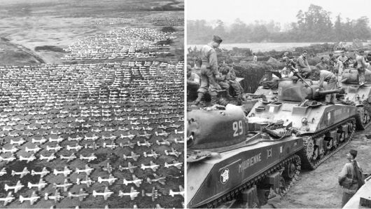 제2차 세계대전 이후, 하늘에서 내려다본 미국 보유 항공기들. 압도적 군수 생산력의 증거였다(왼쪽 사진). 오른쪽 사진은 1944년 6월 노르망디 상륙작전 당시의 미군 병사들과 전차. /연합뉴스 |
