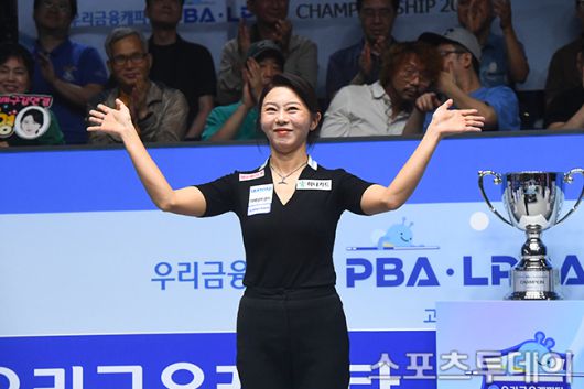 [고양(경기)=스포츠투데이 팽현준 기자] 22일 경기도 고양 킨텍스 PBA 스타디움에서 열린 2025-26시즌 개막전 '우리금융캐피탈 PBA-LPBA 챔피언십 2025' LPBA(여자부) 김가영과 차유람의 결승, 김가영이 4-0으로 우승을 차지하고 있다. 2025.06.22. [스포츠투데이 팽현준 기자 sports@stoo.com]