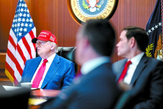 도널드 트럼프 미국 대통령이 21일(현지시간) 백악관 상황실에서 마코 루비오 국무장관 등과 함께 미군의 이란 핵시설 3곳에 대한 공습작전을 지켜보고 있다. 〈EPA=연합뉴스〉 |