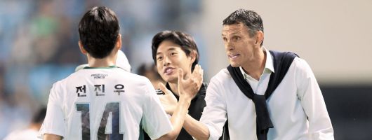 두 번째로 바꾼 건 ‘패스’다. 요즘 K리그는 짧은 패스 위주의 전술을 선호한다. 긴 패스를 활용한 공격은 소위 ‘뻥 축구’라 불리는 구시대 전술로 폄하돼 왔다. 하지만 포옛 감독은 긴 패스 위주의 전술을 사용한다. 후방에서 천천히 공을 주고받다가, 빈 공간을 포착해 긴 패스를 보낸다. 장신 공격수 콤파뇨(195㎝), 티아고(190㎝)가 전방에서 공을 받아내고, 전진우, 김진규, 강상윤 등이 빠르게 올라오며 공격의 속도를 끌어올린다. 레알 마드리드를 이끄는 사비 알론소 감독의 전술과도 닮았다.