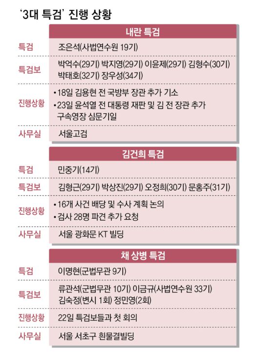 해병대 채 상병 사건 수사를 맡은 이명현 특검도 22일 특검보 4명과 첫 회의를 열었다. 이 특검은 기자들과 만나 윤 전 대통령에 대한 출석 요구 질문에 “당연히 해야 한다. 대면 수사가 원칙”이라고 했다. 이 특검은 국방부에 군 검사 5명 등의 파견을 요청하고 파견자들을 위한 주거 지원도 요청했다.