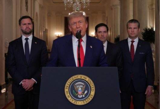 도널드 트럼프 미국 대통령이 21일(현지시간) 워싱턴 DC 백악관에서 이란 핵시설 공습 사실을 확인하는 대국민담화를 하고 있다. 뒷줄 왼쪽부터 JD 밴스 부통령, 마코 루비오 국무장관, 피트 헤그세스 국방장관. /로이터=뉴스1 |