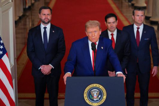 도널드 트럼프 미국 대통령이 21일 미국이 이란의 핵 시설을 폭격했다는 발표 이후 워싱턴 DC 백악관에서 JD 밴스(뒷줄 왼쪽부터) 미국 부통령, 마코 루비오 미국 국무장관, 피트 헤그세스 국방장관과 함께 연설하고 있다. AFP=연합뉴스 |