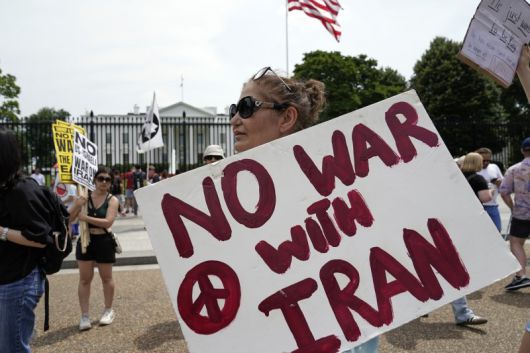 22일(현지시간) 미국 워싱턴 D.C. 백악관 앞에서 시위자들이 미국의 이란 공습을 비난하는 시위를 하고 있다. AP뉴시스 |