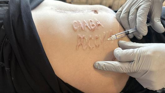▲ 러시아에 포로로 잡혔던 우크라이나 군인 배에 새겨진 '러시아에 영광을'