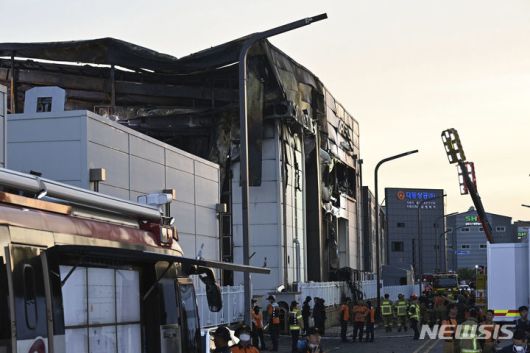 [화성=뉴시스] 김종택 기자 = 지난해 6월 24일 경기 화성시 서신면 소재 일차전지 제조 업체 공장 화재 현장에서 소방대원들이 현장 수습 및 실종자 수색을 하고 있다. 2024.06.24. jtk@newsis.com |