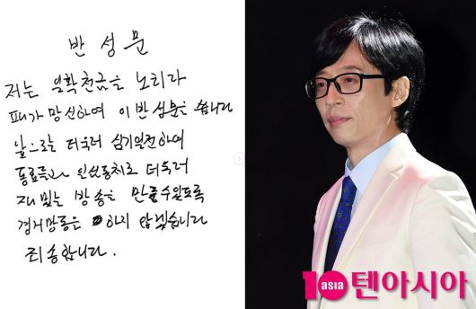 해당 반성문에서 유재석은 "저는 일확천금을 노리다 패가망신하여 이 반성문을 씁니다”라며 “앞으로는 더욱더 심기일전하여 동료들과 일심동체로 더욱더 재밌는 방송을 만들 수 있도록 경거망동을 하지 않겠습니다. 죄송합니다”라고 적었다.