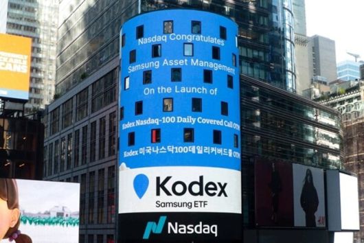 미국 뉴욕 타임스퀘어에 위치한 나스닥 마켓사이트 전광판에 'KODEX 미국나스닥100데일리커버드콜OTM ETF' 상장을 기념해 축하 메시지를 송출하고 있다. 사진|삼성자산운용. |