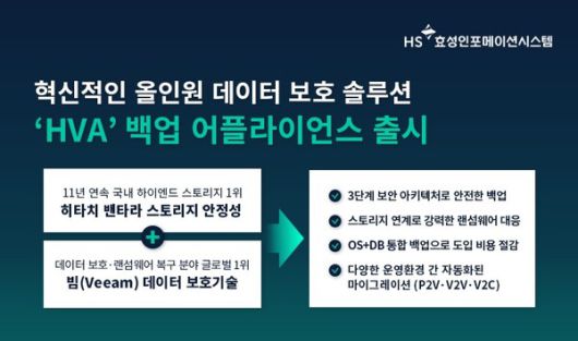 [디지털투데이 황치규 기자]AI·데이터 인프라 솔루션 전문기업 HS효성인포메이션시스템은 히타치 밴타라 고성능 인프라와 데이터 보호 및 랜섬웨어 복구 기업 빔 소프트웨어 기술을 결합한 통합 백업 어플라이언스 'HVA(Hitachi Veeam Appliance)'를 출시했다고 23일 밝혔다.