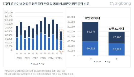 23일 직방 조사에 따르면 올해 하반기에는 전국 총 10만323가구가 입주할 예정이다. 이는 올해 상반기(14만537가구)보다 29% 적고, 전년 동기간인 2024년 하반기(16만3977가구) 대비 39% 감소한 물량이다.