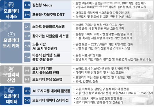 김천형 MaaS, 자율주행 DRT 도입으로 도심 간 연결을 강화하는 한편, 드론 기반 AI 도시안전관리, 생활 물류 배달 시스템 등 도시 포용 서비스를 도입하고, 모빌리티 이노베이션 센터 조성으로 산업 성장을 이끌 계획이다. 한국교통안전공단과 현대자동차, SK플래닛이 참여한다.