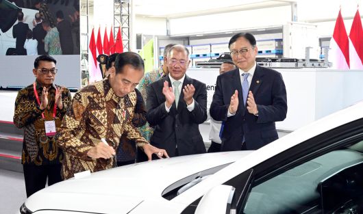 현대차가 최근 인도네시아, 태국, 말레이시아, 베트남 등 동남아 시장을 공략하는데 투자를 늘리고 있다. 지난해 6월 인도네시아에서 진행된 현대자동차 인도네시아산 배터리 탑재 전기차 양산 기념식에서 정의선(오른쪽 두번째) 현대차그룹 회장이 지켜보는 가운데 조코 위도도 인도네시아 대통령이 차량에 서명하고 있다./현대차 제공 |