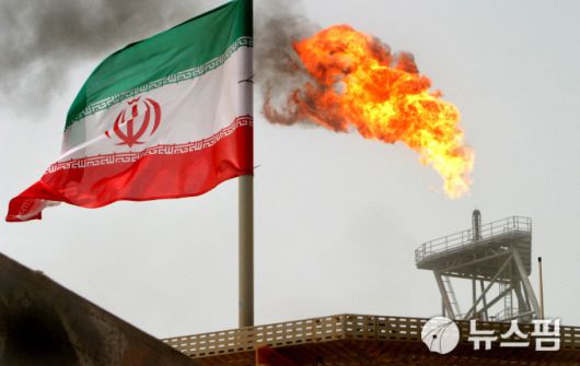 이란 국기 옆으로 석유 생산 시설서 가스가 연소되는 모습 [사진=로이터 뉴스핌] |