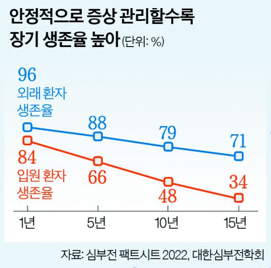 심부전은 입퇴원을 반복하면 사망 위험이 높아지는 경향을 보인다. 김 교수는 “이미 심장 상태가 약한 상태인데 반복적 급성 악화로 심장에 충격이 가해지면서 심장의 펌프 기능 약화가 가속화된다”고 말했다. 그래서 전신 상태가 갑자기 나빠지는 급성 악화를 막아 재입원율을 낮추는 것이 중요하다. 실제 심부전으로 처음 입원했을 때 생존 기간은 2.4년이지만, 두 번째 입원 때는 1.4년, 세 번째는 1.0년, 네 번째는 0.6년으로 줄어든다. 병원의 입퇴원을 반복할수록 사망 위험이 높아진다는 의미다. 특히 심부전 증상이 안정돼 퇴원한 직후에 가장 조심해야 한다. 김 교수는 “입원했을 땐 문제 상황이 발생했을 때 즉각적으로 약 용량을 조절하면서 관리하지만 퇴원하면 그러기 힘들어 갑자기 상태가 나빠질 수 있다”고 말했다. 심부전 환자 4명 중 1명은 퇴원 30일 이내에 재입원한다. 이 시기의 사망 위험도 최대 10%로 높다. 반면에 외래에서 안정적으로 심부전을 관리했을 때 10년 생존율은 무려 79%다. 중증 심부전으로 입원 치료했을 때 10년 생존율 48%와 비교해 차이가 확실하다. 김 교수가 소속된 대한심부전학회에서 반복적 입퇴원을 막는 선제적 치료 전략을 강조하는 이유다. 또 보건 당국에 급성 악화로 집중 치료가 필요한 중증 심부전에 대해 중증 질환으로 재분류할 것을 요청했다.