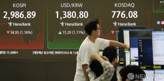 [서울=뉴스핌] 양윤모 기자 = 미국이 이란의 핵시설을 폭격한 가운데, 23일 오전 코스피가 전장 종가보다 34.95 포인트(1.16%) 하락하며 2,986.89로, 코스닥은 15.44포인트(1.95%) 하락한 776.08로 시작한 가운데, 서울 중구 하나은행 딜링룸에서 직원들이 업무를 보고 있다. 서울외환시장에서 원·달러 환율은 전장 대비 15.20원 상승한 1,380.80원에 거래를 시작했다. 2025.06.23 yym58@newspim.com |