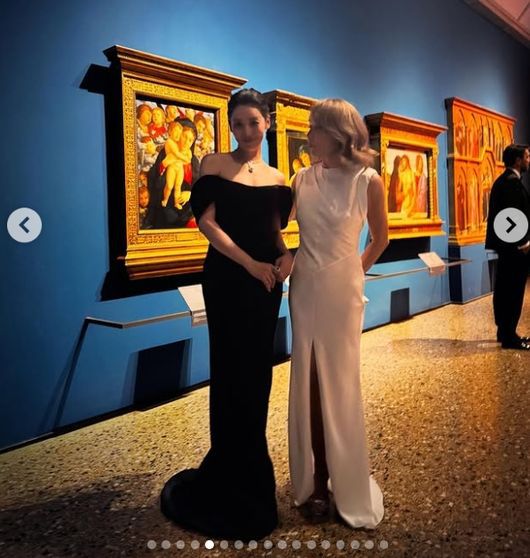 특히 차주영 특유의 길고 곧은 목선과 투명한 피부가 블랙 드레스와 극명한 대비를 이루며 시선을 압도했다. 그는 게시물과 함께 “A magical night with magical masterpieces. Delighted to meet the adorable, and yet so elegant and beautiful”이라는 글을 남기며 설레는 순간을 팬들과 공유했다.