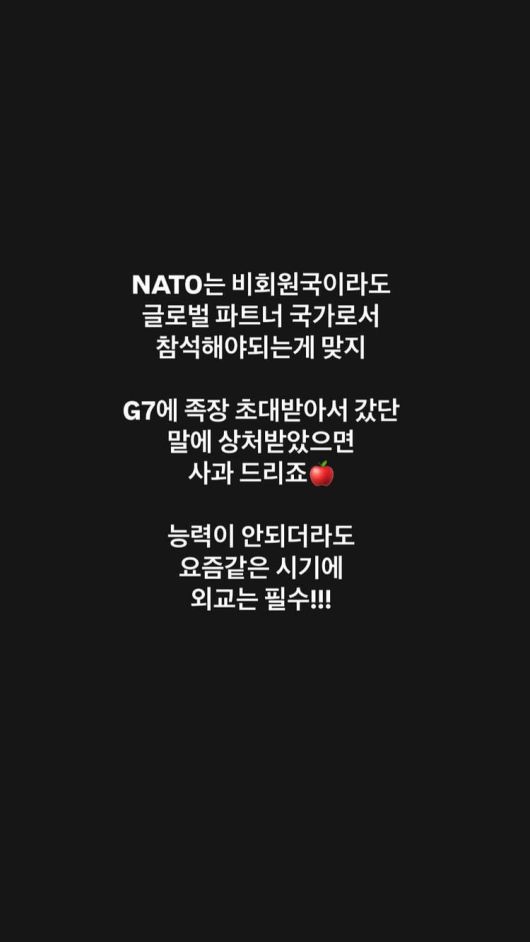 23일 그는 자신의 계정에 “그는 23일 개인 계정 스토리에 “NATO는 비회원국이라도 글로벌 파트너 국가로서 참석해야되는게 맞지”라고 적었다.