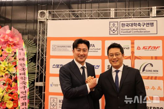 [서울=뉴시스]안정환(왼쪽)과 박한동 대학축구연맹 회장. (사진=대학축구연맹 제공) |