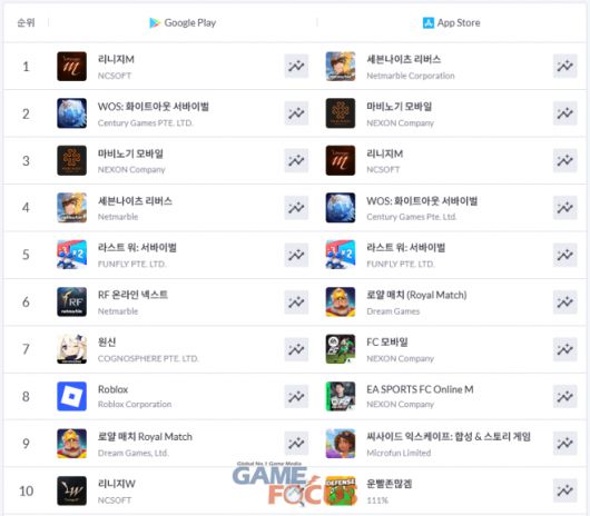 구글 플레이와 애플 앱스토어 양대 앱 마켓 TOP 5를 살펴보면, '리니지M'과 '세븐나이츠 리버스'가 각각 1위를 차지하고 있다. '마비노기 모바일'이 업데이트 효과로 순위가 상승하는 한편, '화이트아웃 서바이벌'과 '라스트 워: 서바이벌' 등의 게임들도 여전히 이름을 올리고 있다.