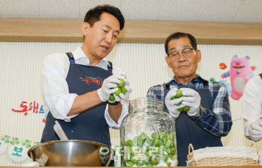 [이데일리 김태형 기자] 오세훈(왼쪽) 서울시장이 23일 서울 영등포쪽방상담소에서 열린 온기창고 개소식에 참석해 주민대표와 매실청을 담그고 있다.